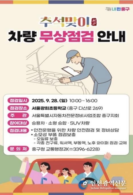 [인천광역신문] 최훈 기자 | 서울 중구가 오는 28일 서울특별시자동차전문정비사업조합 중구지회와 함께‘추석맞이 차량 무상 점검’을 실시한다. 장거리 주행이 많은 추석 귀성길에 주민들이 사고 없이 안전하고 즐거운 명절을 보내도록 지원하기 위해서다.