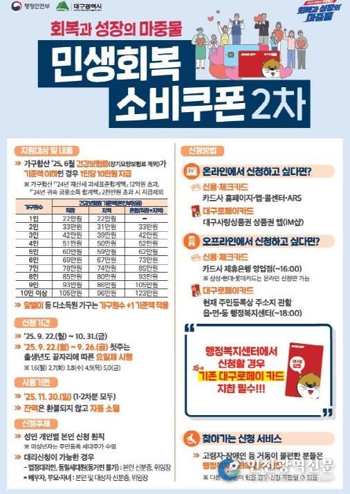 [인천광역신문] 관리자 기자 | 대구광역시는 정부의 민생회복 소비쿠폰 2차 지급기준이 확정됨에 따라 세부 지급계획을 마련하고, 소득 기준을 충족하는 대구 시민 215만 1천 명(91.3%)을 대상으로 9월 22일부터 1인당 10만 원씩, 2,151억 원 규모의 소비쿠폰 2차 신청·접수를 시작한다.