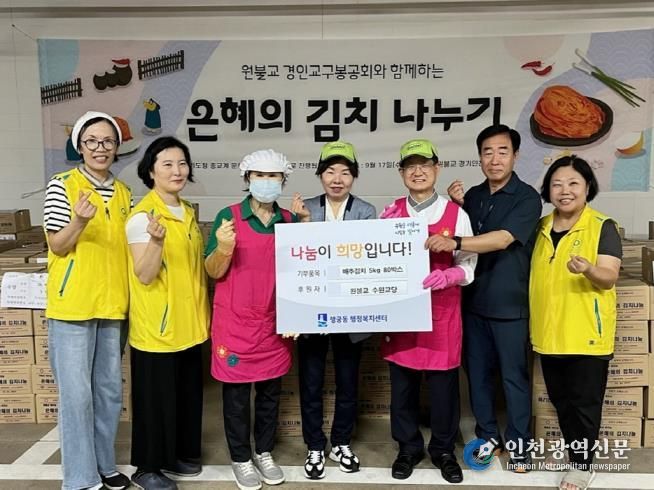 [인천광역신문] 관리자 기자 | 원불교 수원교구가 민족 대명절 한가위를 앞두고 소외된 이웃을 위한 따뜻한 나눔을 실천했다. 수원시 팔달구 행궁동 행정복지센터에 배추김치 5kg 80박스를 후원한 것이다.