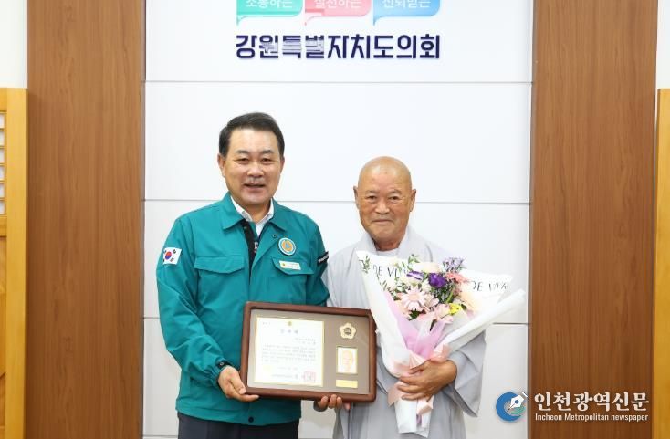 [인천광역신문] 관리자 기자 | 강원특별자치도의회는 9월 18일, 강원특별자치도의회에서 지역사회 봉사와 종교․문화 발전에 기여한 공로로 원주지역의 현각스님(원주 성불원 주지)에게 감사패를 전달했다.