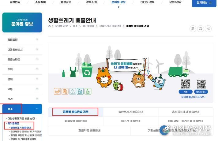 [인천광역신문] 최훈 기자 | 서울 강북구는 생활폐기물의 올바른 분리배출을 돕기 위해 구청 홈페이지에 ‘청소’ 메뉴를 신설하고, 주민 맞춤형 폐기물 분리배출 안내시스템을 운영한다고 밝혔다. 주요 기능은 품목별 검색으로, 9월 시범운영을 거쳐 10월부터 정식 운영에 들어간다.