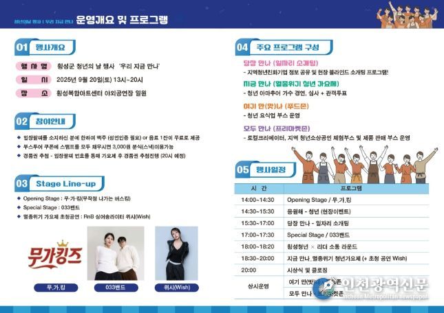 [인천광역신문] 관리자 기자 | 횡성군은 지역 청년들의 사회 참여 확대와 경제적 역량 강화를 위해 20일, 횡성복합아트센터 야외공연장 일원에서 ‘2025 청년의 날 행사’를 성대하게 개최한다.