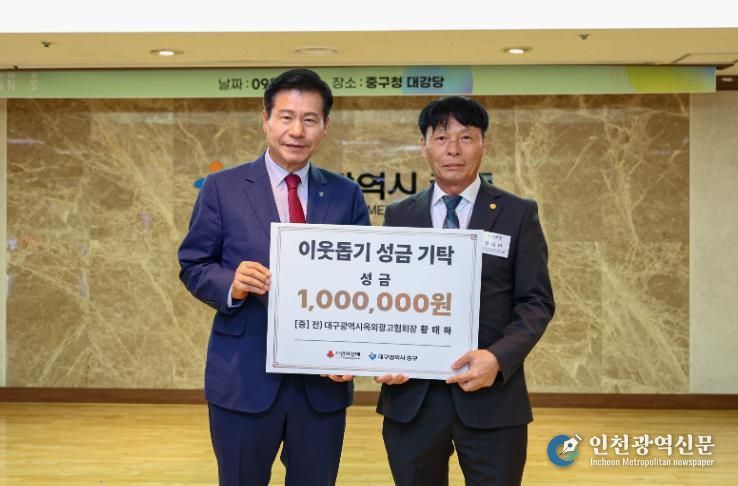 [인천광역신문] 관리자 기자 | 대구광역시 옥외광고협회 황태하 전 회장은 지난 22일 대구 중구청을 방문해 추석을 맞아 어려운 이웃을 위한 성금 100만 원을 전달했다.