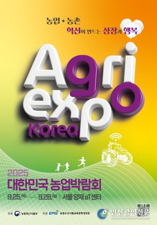 [인천광역신문] 관리자 기자 | 농림축산식품부는 '2025 대한민국 농업박람회'를 9월 25일부터 28일까지, 서울 에이티(aT)센터(서울 서초구 양재동)에서 개최한다고 밝혔다.