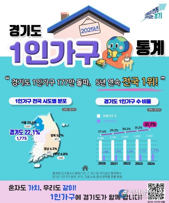 [인천광역신문] 관리자 기자 | 경기도 1인가구는 177만 가구이며, 도 전체 가구 가운데 31.7%를 차지하고 있는 것으로 나타났다. 경기도의 1인가구 수는 2020년부터 매년 전국 최고치를 경신하고 있다.