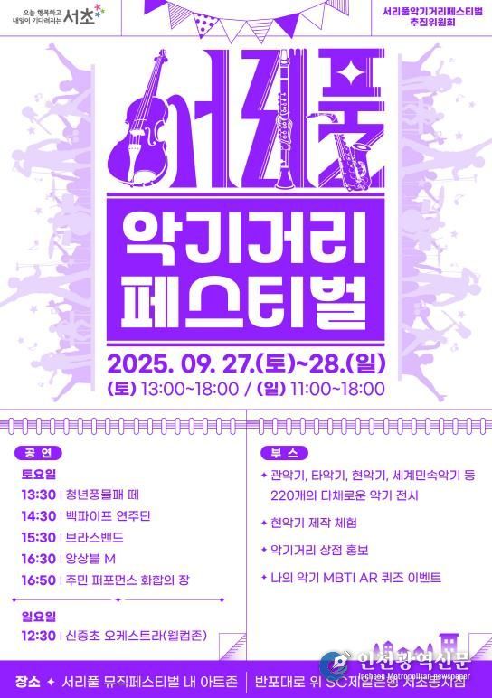 [인천광역신문] 최훈 기자 | 서울 서초구는 '2025 서리풀뮤직페스티벌' 기간인 오는 27일부터 28일까지 반포대로 일대에서 ‘제7회 서리풀 악기거리 축제’를 개최한다고 밝혔다. ‘서리풀 악기거리 축제 추진단’이 주최·주관하는 이번 축제는 국내 유일 음악문화지구인 서리풀 악기거리에서 구의 악기거리 인프라를 활용해 모두가 함께 만들어 가는 문화축제다.