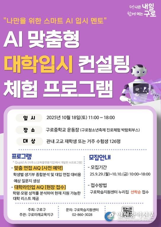 [인천광역신문] 최훈 기자 | 구로구가 10월 18일 오전 11시부터 구로중학교 운동장에서 AI와 함께하는 대학 입시 상담(컨설팅)을 개최한다고 밝혔다.