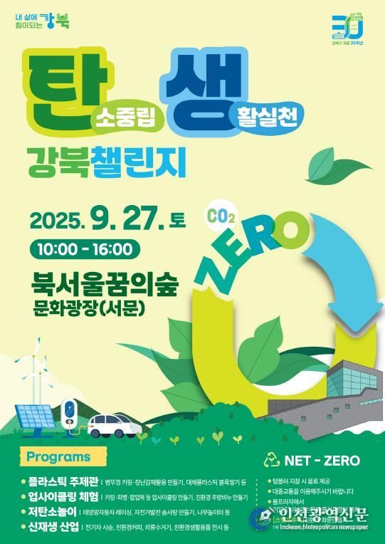 [인천광역신문] 최훈 기자 | 서울 강북구는 오는 9월 27일 오전 10시부터 오후 4시까지 북서울꿈의숲 일대에서 ‘탄생 강북 챌린지(탄소중립 생활실천 강북 챌린지)’와 ‘2025 나눔과 순환의 즐거운 장터’를 개최한다.