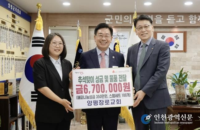 [인천광역신문] 관리자 기자 | 양평군은 지난 23일 양평장로교회가 추석 명절을 맞아 어려운 이웃을 돕기 위해 320만 원 상당의 스팸세트 100개와 해피 나눔 성금 350만 원을 기탁했다고 밝혔다.