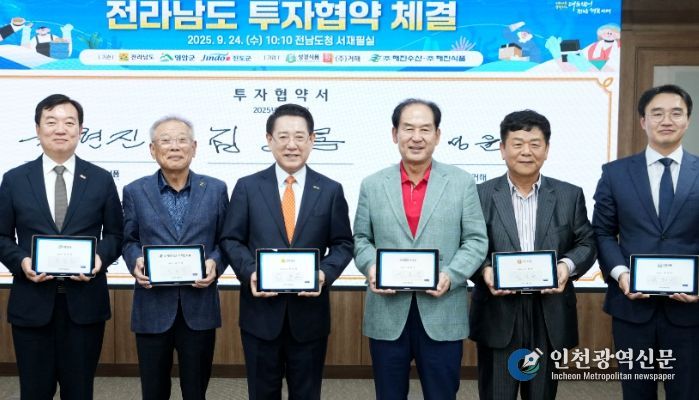 [인천광역신문] 관리자 기자 | 전라남도는 24일 도청 서재필실에서 ㈜성경식품, ㈜해진수산, ㈜해진식품 등 3개사와 투자금액 총 1천34억 원 규모의 투자협약을 했다고 밝혔다. 이번 투자로 302명의 신규 고용 창출도 기대된다.