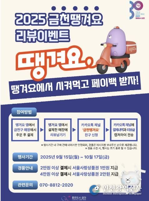 또한 10월 17일까지는 ‘금천땡겨요 리뷰 이벤트’도 함께 진행된다. 땡겨요 앱으로 음식을 주문한 뒤 카카오톡 채널 ‘금천땡겨요’에 리뷰를 작성하면 주문 금액에 따라 서울사랑삼품권을 지급한다. 2만 원 이상 결제 시 1만 원, 4만 원 이상 결제 시 2만 원을 페이백 형식으로 돌려받을 수 있으며, 예산 소진 시 조기 종료된다.
