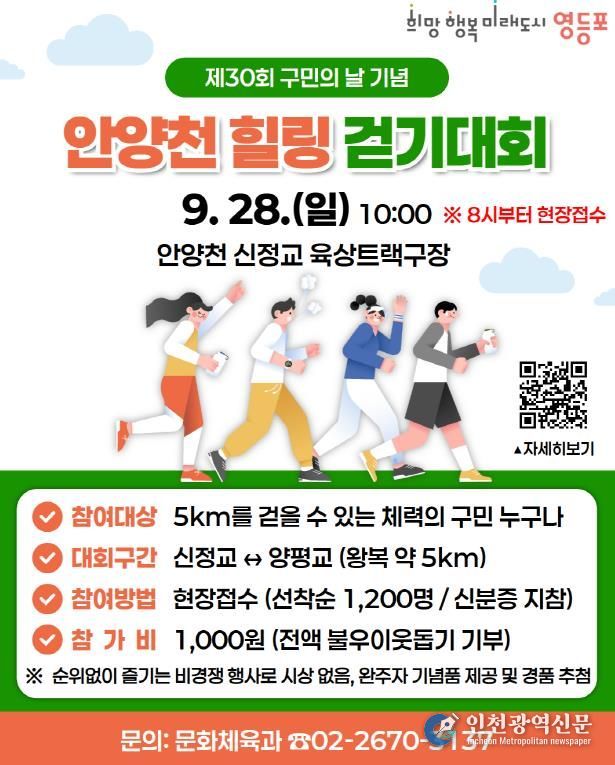 [인천광역신문] 최훈 기자 | 영등포구가 제30회 구민의 날을 기념해 오는 9월 28일 안양천 신정교 육상트랙구장에서 ‘안양천 힐링 걷기대회’를 개최한다고 밝혔다. 대회는 영등포구 육상연맹에서 주관하고 영등포구와 영등포구 체육회에서 후원한다.