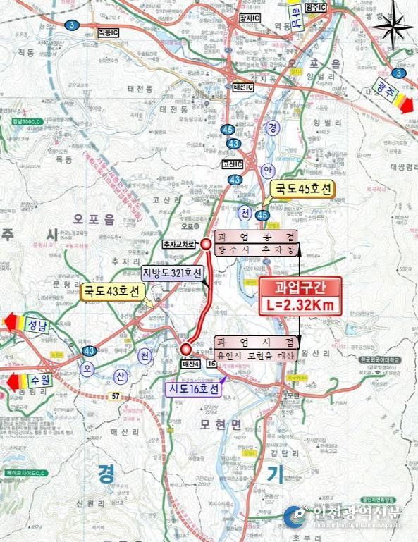 [인천광역신문] 관리자 기자 | 용인시 처인구 모현읍 매산리와 광주시 추자동을 연결하는 ‘지방도321호선 매산~일산간 도로 확포장공사’가 완료돼 25일 낮 12시부터 공식 개통한다.