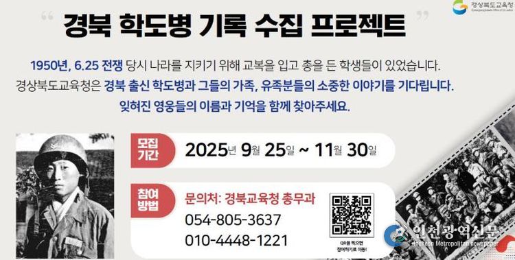 제보는 ‘경북 출신 학도병을 알고 있는 누구나’ 전화 또는 QR로 참여할 수 있으며, 모집 기한은 11월 30일까지다.