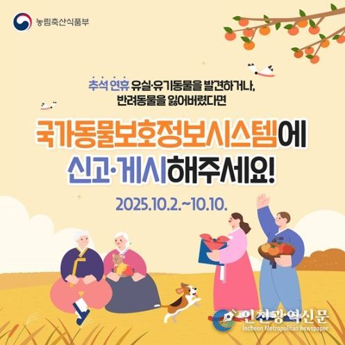 [인천광역신문] 관리자 기자 | 추석 연휴 유실·유기동물을 발견하거나, 반려동물을 잃어버렸다면 국가동물보호정보시스템에 신고·게시해주세요!