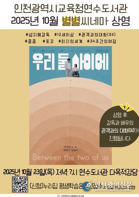 [인천광역신문] 최예준 기자 | 인천광역시교육청연수도서관은 10월 23일 오후 7시 다목적강당에서 성지혜 감독의 장편 영화 ‘우리 둘 사이에’를 상영한다.