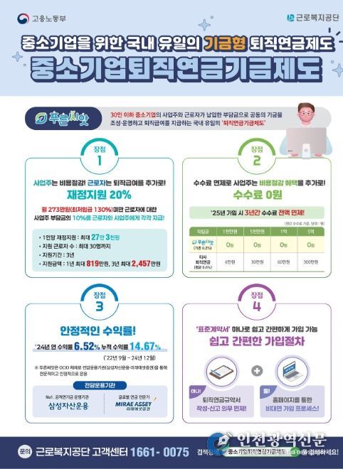 푸른씨앗의 주요 혜택은 ▲월 급여 273만원 미만 근로자에 대해 사업주와 근로자에게 부담금의 10% 지원금 지급 ▲운용수수료 전액 면제 ▲간소한 가입 절차로 사업주의 행정 부담 완화 등이 있다.