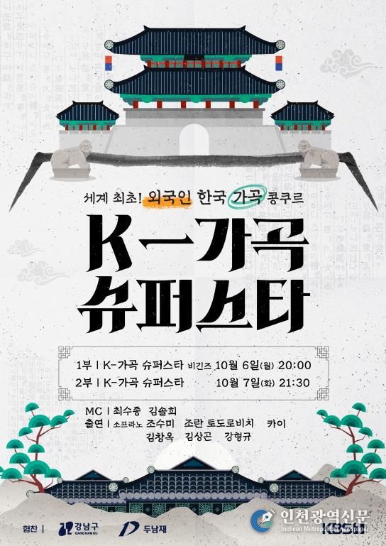 [인천광역신문] 최훈 기자 | 꿈이 모이는 도시, 미래를 그리는 강남구가 개청 50주년을 맞아 한국 가곡의 아름다움을 세계 무대에 알리는 글로벌 경연 'K-가곡 슈퍼스타'를 후원한다. 이번 행사는 오는 9월 30일 오후 7시 여의도 KBS홀에서 열리며, 전 세계 11개국 13명의 외국인 성악가가 무대에 올라 한국 가곡을 선보인다.