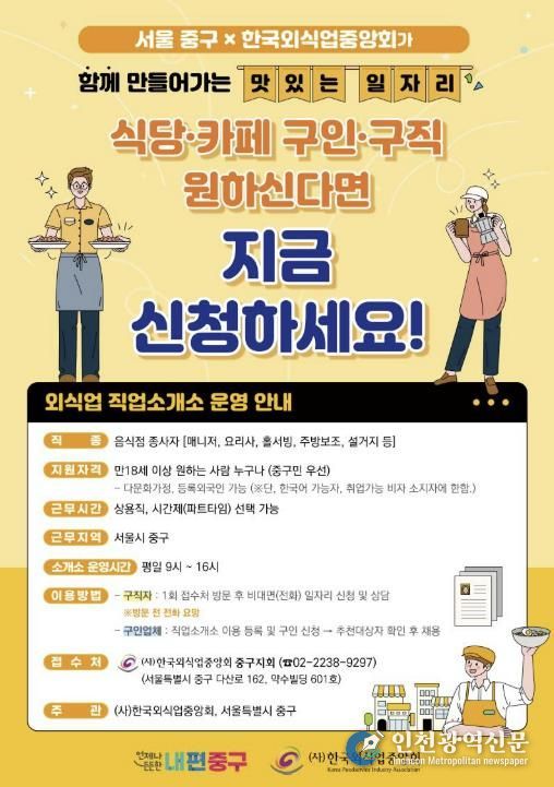 [인천광역신문] 최훈 기자 | 서울 중구가 직무교육을 통해 인재를 키우고 지속적인 구민 맞춤 일자리 창출을 위해 '2025 외식업 특화 직무양성과정'과 '한국외식업 중앙회 구인·구직 연계 사업'을 처음으로 운영한다.