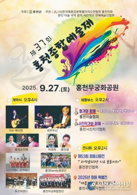 [인천광역신문] 관리자 기자 | 홍천군이 주최하고 (사)한국예총홍천지회(회장 백금산)와 산하 6개 지부(문인, 미술, 국악, 음악, 사진작가, 연예예술인협회)가 주관하는 '제37회 홍천종합예술제'가 오는 9월 27일 오후 4시 홍천무궁화공원에서 성대하게 개막한다.