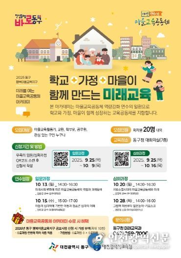 [인천광역신문] 관리자 기자 | 대전 동구는 학생들의 행복한 성장을 지원하기 위해 학교와 가정, 지역사회가 하나 돼 협력하는 ‘미래를 여는 마을교육공동체 아카데미’를 개최한다고 25일 밝혔다.