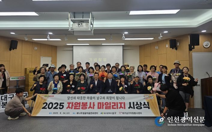 [인천광역신문] 관리자 기자 | 대구 남구는 대구 남구자원봉사센터(센터장 이창지)와 함께 지난 9월 24일, '2025 자원봉사 마일리지 시상식'을 열고 한 해와 오랜 세월 동안 지역사회를 위해 헌신해 온 우수 자원봉사자들에게 인증메달, 공로패, 핸드프린팅을 수여했다.