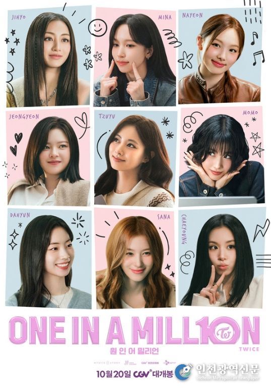 [인천광역신문] 관리자 기자 | 트와이스 데뷔 10주년을 기념하는 히스토리 무비 <원 인 어 밀리언(ONE IN A MILL10N)>이 9인 9색의 스페셜 포스터와 진심을 전하는 메인 예고편을 공개했다.[감독: 와사비마요ㅣ출연: 트와이스ㅣ제작: 미스틱스토리ㅣ배급: CJ CGV, CJ 4DPLEXㅣ장르: 다큐멘터리]