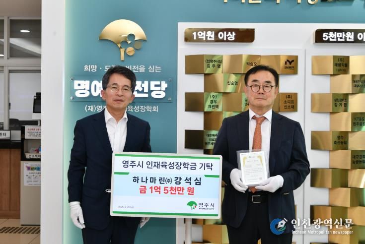 [인천광역신문] 관리자 기자 | (재)영주시인재육성장학회는 지난 26일, 하나마린㈜ 강석심 회장이 영주 지역 인재를 위한 장학금 1억 5천만 원을 기탁했다고 밝혔다.
