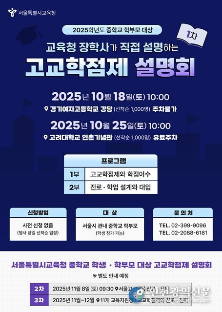 [인천광역신문] 관리자 기자 | 서울시교육청은 고교학점제에 대한 이해도를 높이고 학생들의 진로·학업 설계를 돕기 위하여, 2025학년도 중학교 학부모를 위한 고교학점제 설명회를 개최한다.