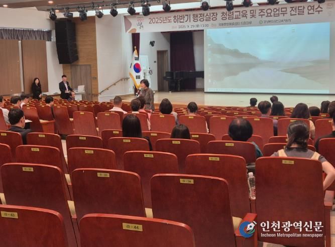 [인천광역신문] 관리자 기자 | 경상북도김천교육지원청은 9월 29일 13시 학생문화예술센터 드림마루에서 관내 초·중·고등학교 행정실장을 대상으로 청렴교육 및 주요업무 전달연수를 개최했다.