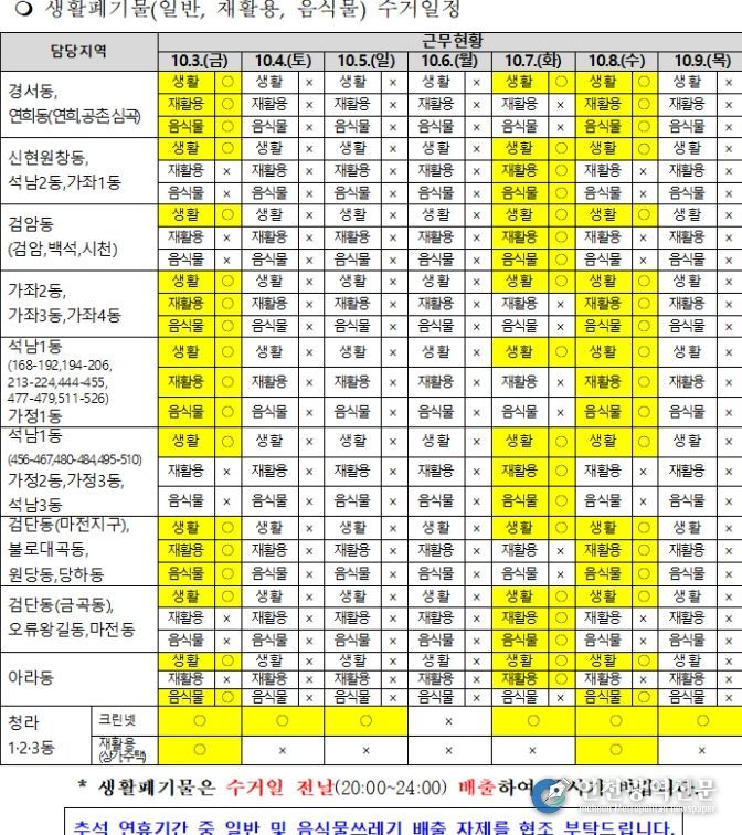 [인천광역신문] 최예준 기자 | 인천 서구는 추석을 맞아 연휴기간 동안 차질 없는 쓰레기 관리로 쾌적한 명절분위기를 조성하고자 ‘추석 연휴 생활폐기물 관리 종합대책’을 수립·추진한다.