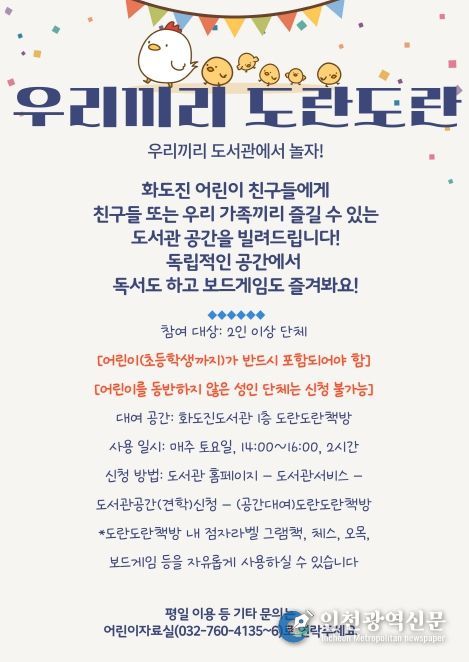 자세한 사항은 화도진도서관 누리집공지사항을 확인하거나 어린이자료실로 문의하면 된다.