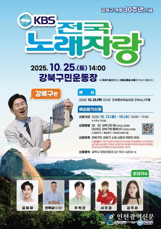 [인천광역신문] 최훈 기자 | 강북구는 개청 30주년을 기념해 오는 10월 25일 오후 2시 강북구민운동장에서 KBS 장수 예능 프로그램 ‘전국노래자랑’ 강북구편을 개최한다고 밝혔다.