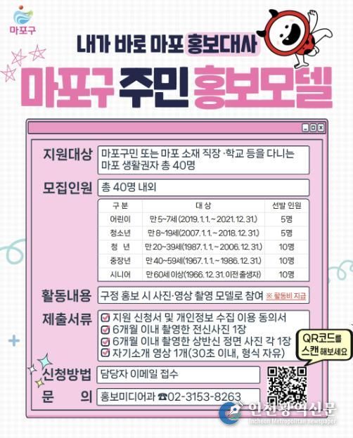 [인천광역신문] 최훈 기자 | 마포구는 10월 1일부터 10월 17일까지 ‘마포구 주민 홍보모델’을 모집한다.