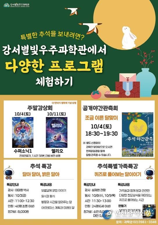[인천광역신문] 최훈 기자 | 서울 강서구는 추석 연휴를 맞아 강서별빛우주과학관(금낭화로 178)에서 특별 프로그램을 운영한다.