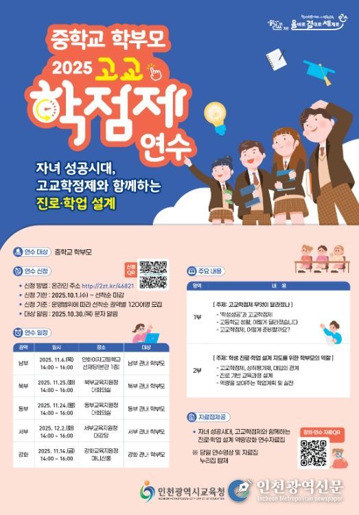 이번 연수는 11월 6일부터 12월 2일까지 인천 관내 중학교 학부모를 대상으로 진행되며, 고교학점제와 교육과정에 대한 이해를 높이고 학부모의 진로·학업 지원 역량을 강화하기 위해 마련됐다.