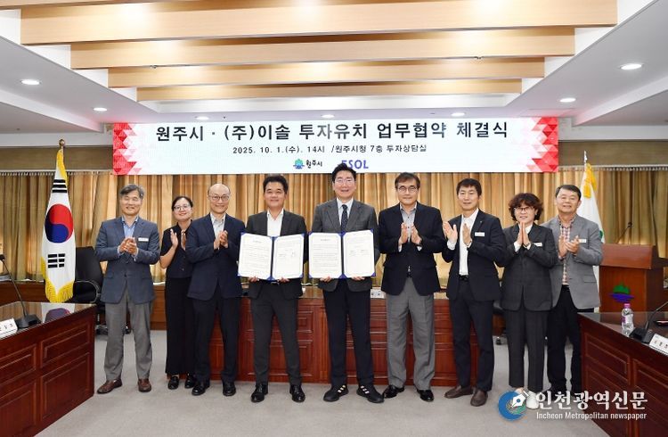 [인천광역신문] 관리자 기자 | 원주시는 10월 1일 오후 2시, 시청 7층 투자상담실에서 ㈜이솔(대표 김병국)과 투자유치 협약(MOU)을 체결했다. 이번 협약은 총 505억 원 규모의 투자로, 부론일반산업단지에 소형 방사광가속기와 첨단 EUV 반도체 검사장비 연구·생산시설을 구축하는 사업이다. EUV(Extreme Ultra-Violet)는 반도체 초미세 공정(7nm 이하)에 필수적인 광원이다.