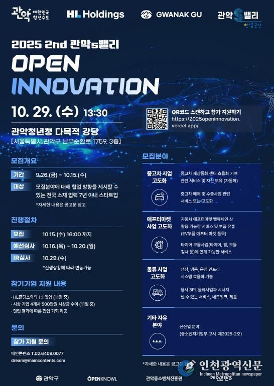 [인천광역신문] 최훈 기자 | 관악구가 자동차, 물류 분야 글로벌 네트워크를 보유한 ‘HL홀딩스’와 함께 ‘2025 제2회 관악S밸리 오픈 이노베이션’에 참가할 기업을 모집한다.