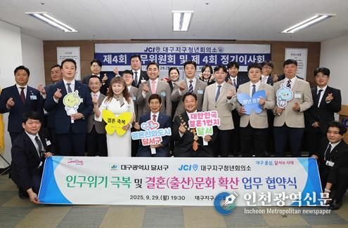 [인천광역신문] 관리자 기자 | 대구 달서구는 지난 29일 대구지구청년회의소(회장 이성범)와 초저출생 인구 위기 극복 및 긍정적 결혼문화 확산을 위한 업무협약을 체결했다.