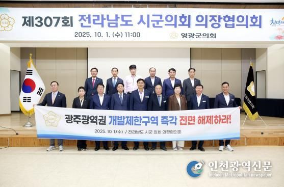 [인천광역신문] 관리자 기자 | 전라남도 시군 의회 의장협의회는 지난 10월 1일 영광군의회에서 개최된 제307회 정례회의에서“광주광역권 개발제한구역 전면 해제 촉구 건의안”을 만장일치로 채택했다.