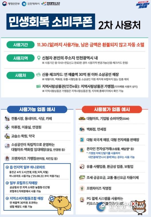 민생쿠폰은 지역사랑상품권(인천e음) 가맹점에서 사용가능하며, 신용·체크카드는 일부 업종을 제외하고 연 매출액이 30억 이하인 음식점, 카페, 동네마트 등 소상공인 매장에서 사용할 수 있다.
