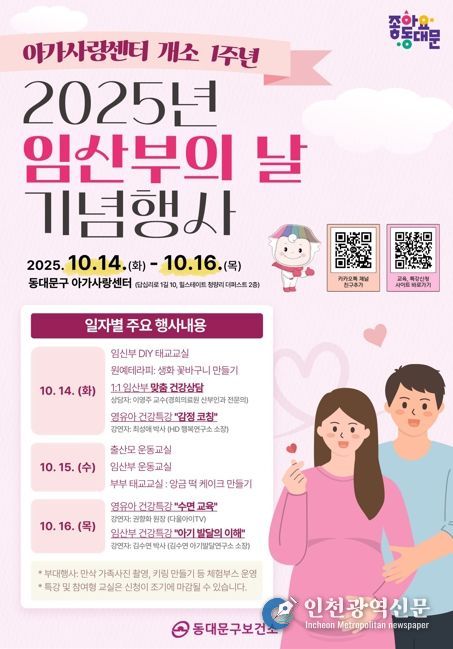[인천광역신문] 최훈 기자 | 서울 동대문구는 오는 14일부터 16일까지 아가사랑센터 개소 1주년과 ‘2025년 임산부의 날’을 맞아 다양한 기념행사를 개최한다고 밝혔다.
