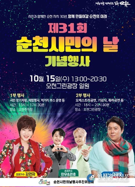 제31회 순천시민의 날 축하 공연 피날레로 쿨 이재훈, 레전드 가수 김연자, 트로트계 신동으로 떠오르고 있는 황민호, 그의 형이자 리틀싸이 민우 가수가 출연, 다양한 축하 공연이 진행되고 28만 순천시민이 함께 즐기는 화려한 불꽃쇼가 가을 밤하늘을 수놓으며 시민들에게 감동의 순간을 선사할 계획이다. 개인 돗자리를 지참하면 더 편안하게 관람할 수 있다.