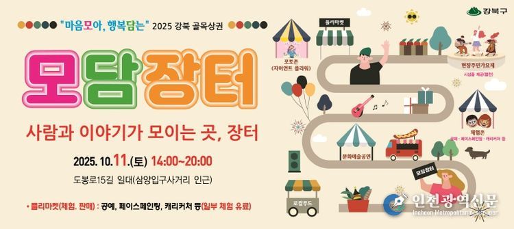 [인천광역신문] 최훈 기자 | 서울 강북구는 오는 11일 오후 2시부터 8시까지 삼양입구사거리 인근 도봉로15길 일대에서 ‘2025 강북 골목상권 모담장터’를 개최한다고 밝혔다.