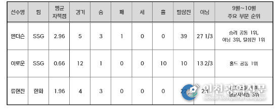 SSG 앤더슨은 9~10월 5경기에 선발 등판해 3승을 거두며 승리 부문 공동 1위에 올랐다. 평균자책점 2.96을 기록했고, 삼진 39개를 잡아내며 탈삼진 부문 월간 1위를 차지했다. 앤더슨은 9~10월 경기 당 평균 8개에 가까운 탈삼진을 잡으며 245탈삼진으로 정규시즌을 마무리했다.