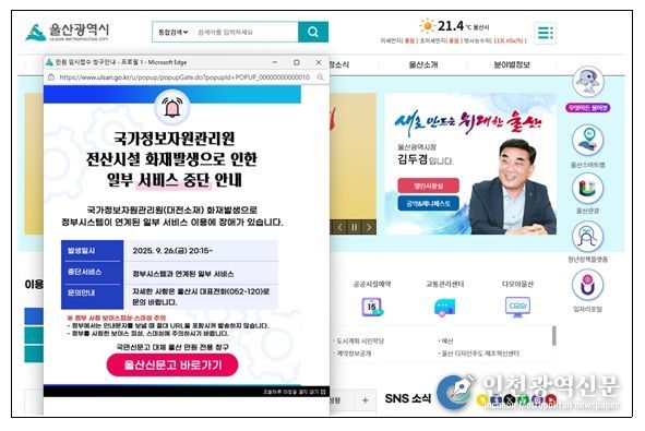 [인천광역신문] 관리자 기자 | 울산시는 국가정보자원관리원 대전센터 화재(9.26)로 인해 국민신문고 서비스가 전면 중단됨에 따라, 시민 불편을 최소화하기 위해 울산시 대표 홈페이지 내 온라인 민원창구 ‘울산신문고’를 10월 5일부터 운영한다.