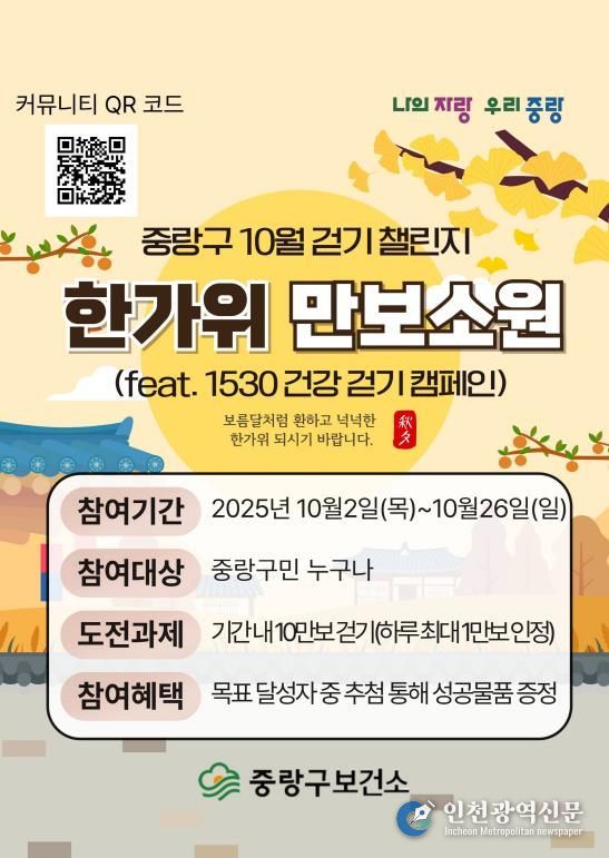 [인천광역신문] 최훈 기자 | 중랑구는 모바일 걷기 앱을 활용한 '온라인 걷기 챌린지'를 10월 2일부터 26일까지 25일간 운영한다. 이번 챌린지는 구민들의 일상 속 걷기 실천율을 높이고, 건강한 생활습관을 유도하기 위해 마련됐다.