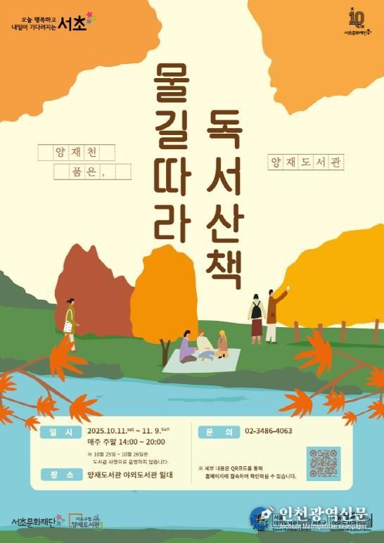 [인천광역신문] 최훈 기자 | 서울 서초구에서는 가을의 시원한 바람을 느끼며 독서의 즐거움을 만끽할 수 있을 전망이다. 서초구립양재도서관은 오는 11일부터 11월 9일까지 매주 토, 일요일에 ‘오솔숲 야외도서관’과 양재천변에서 '양재천 품은 양재도서관'을 운영한다고 밝혔다.