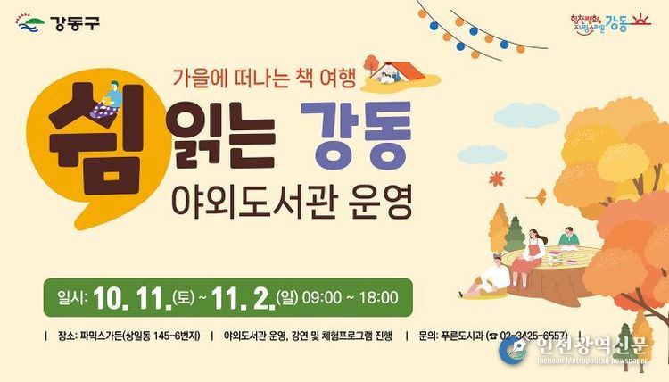 [인천광역신문] 최훈 기자 | 강동구는 10월 11일부터 11월 2일까지 한 달간 파믹스가든(상일동 145-6)에서 주말 야외 도서관 '쉼 읽는 강동'을 운영한다고 밝혔다.
