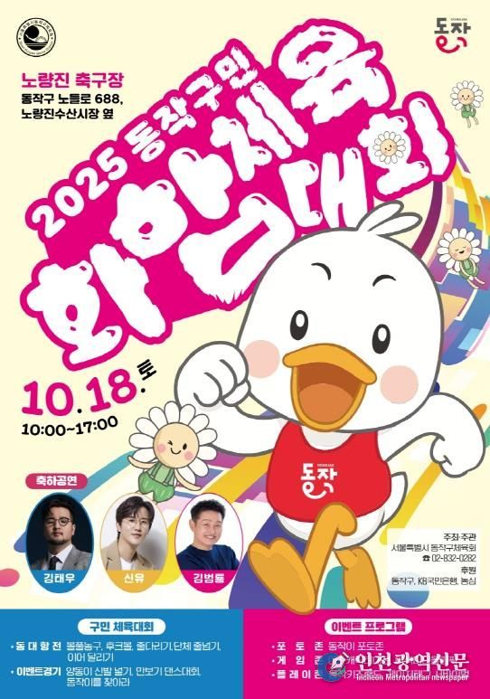 [인천광역신문] 최훈 기자 | 동작구가 오는 18일 오전 10시 노량진축구장(노들로 688)에서 ‘2025 동작구민 화합 체육대회’를 개최한다고 밝혔다.